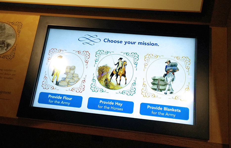 Explore, zoom, touch and discover the three phases of George Washington’s troop camp: from cutting the forest to building the encampments to the aftermath, this interactive brings the historical mural illustrations to life. Each visitor gets their own lens to inspect the mural in fine detail. Touch a hotspot and learn more, then fling it over to a friend! How many points of interest can you find?