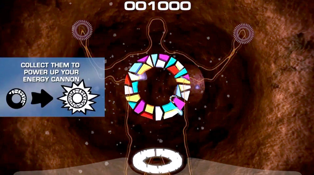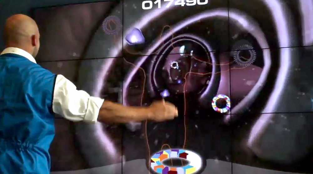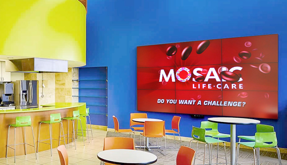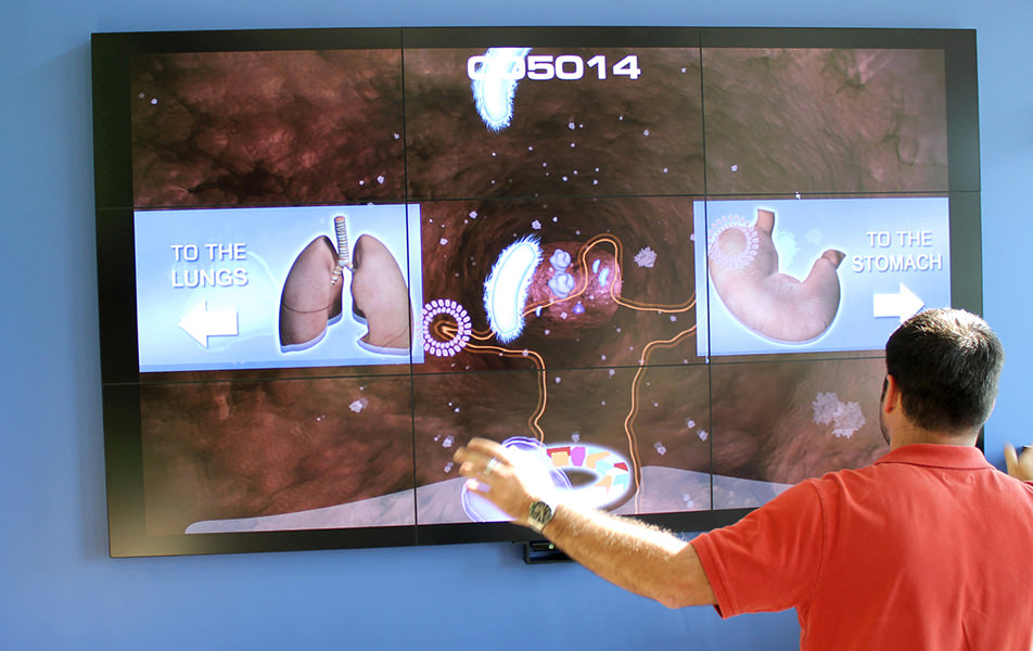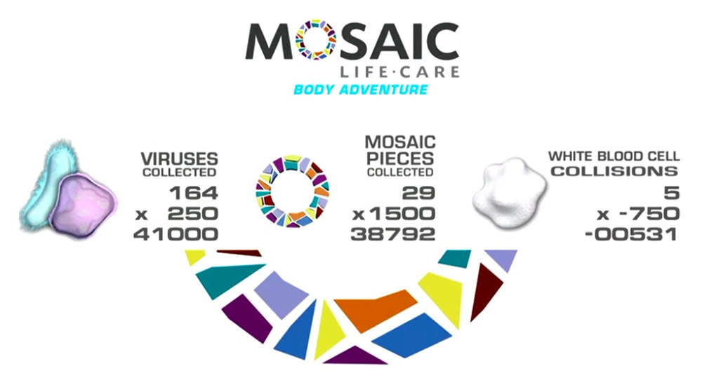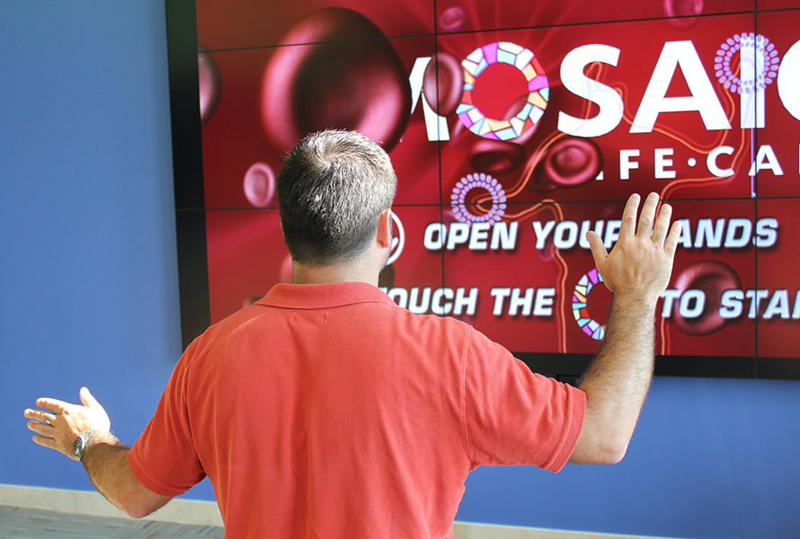 Created primarily to intrigue, entertain, and subtly educate visitors in the lobby of Mosaic LifeCare’s medical center, the Xbox Kinect system activates when someone simply walks up to the large video wall. No buttons, nothing to touch : It’s all done with sensors and the imagination of Perfect Prototype.